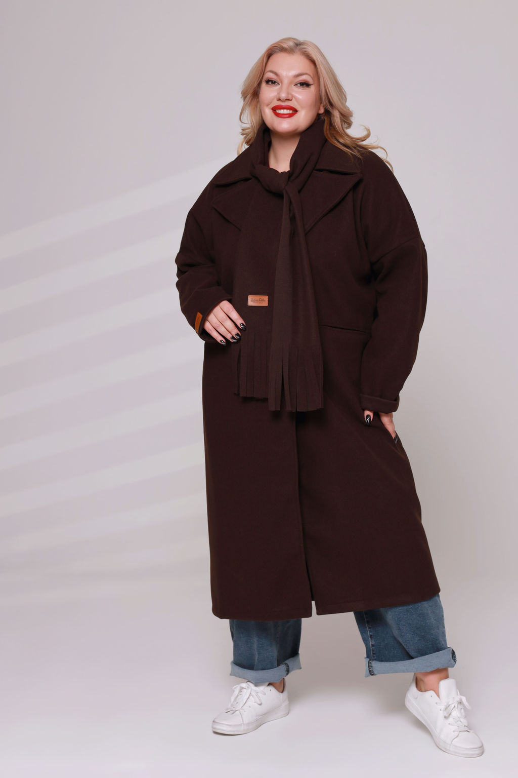 Лаконичное пальто оверсайз из мягкого материала с шарфом это универсальная вещь для холодной погоды. Глубокий V-образный вырез оформлен отложным воротником с лацканами. Приспущенные рукава полной длины по низу оформлены отворотами. Прорезные карманы по бокам добавляют модели практичности. Застегивается пальто на оригинальные пуговицы. Модель отлично сочетается с любым предметом гардероба. Вы можете сочетать его с платьями, юбками различной длины, брюками и джинсами. Пальто универсально, поэтому и одежда к нему подходит абсолютно любая. Будет стильно смотреться как с обувью на высоких каблуках, которая придает вам женственности и элегантности, так и с повседневными удобными кроссовками.­