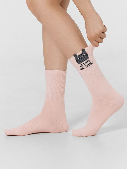 рис.3012 Женский носок с высоким плотным бортом, рисунком в виде котика и надписи.­