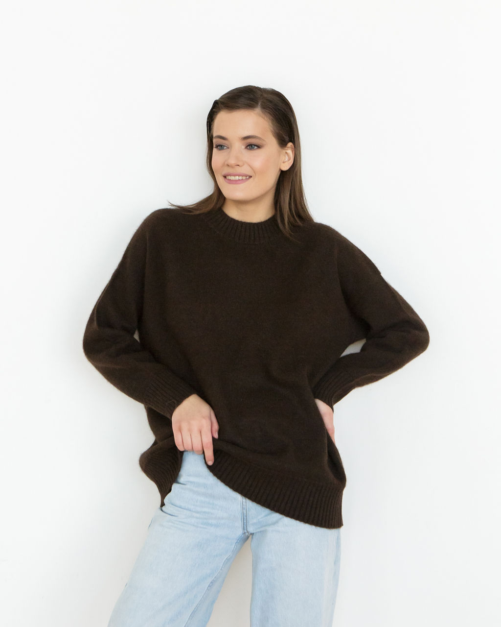 Свободный крой создает ощущение непринужденности и комфорта. Круглый вырез и базовый дизайн делают джемпер универсальным элементом гардероба. Темно-коричневый оттенок изысканная альтернатива классическим нейтральным цветам.