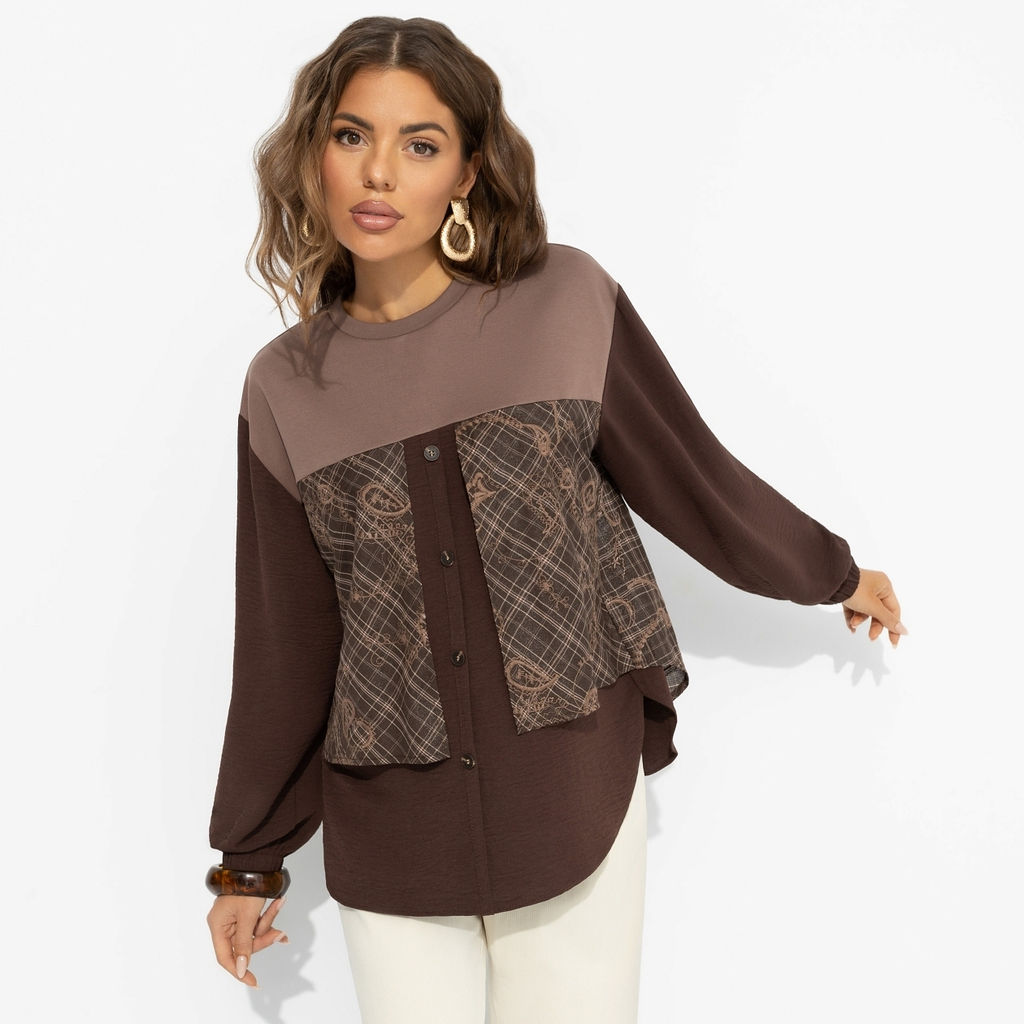 Фьюжн ? в офисном гардеробе! Этот свитшот прогоняет скуку серых будней: сочетание фактур, оттенков и узоров намекает, что смелость в стиле ? вещь только для взрослых. Любите эксперименты? Вам сюда. Свитшот из трикотажа в комбинации нескольких видов ткани. Гамма шоколадных оттенков, свободный крой.­