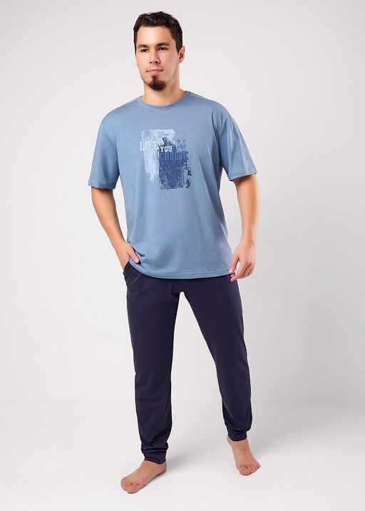 Набор состоящий из футболки и брюк. Футболка из хлопковой кулирной глади с декоративными резами с коротким рукавом и принтом. Брюки из плотной хлопковой кулирной глади с добавлением эластана на широком поясе с резинкой и шнуром, по бокам карманы. 100% хлопок