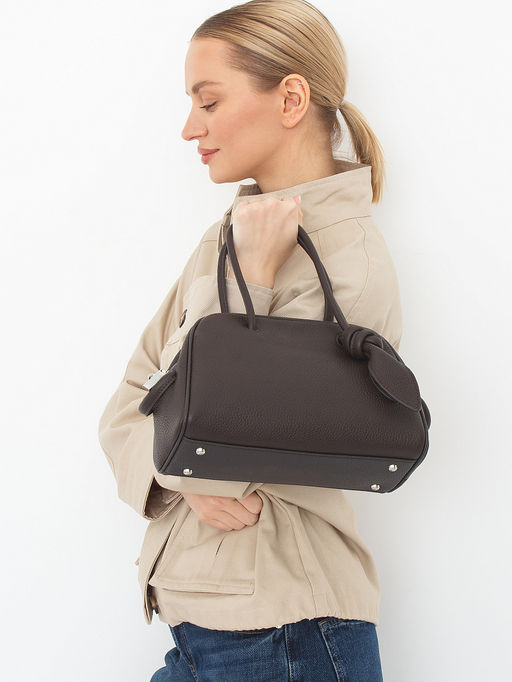 Компактная сумка, выполнена из натуральной кожи. Декорирована эффектной ручкой. Дополнена серебристой фурнитурой. Данная модель закрывается на молнию. Каркас полужесткий. Носится в руке за встроенные ручки или через плечо. В комплекте имеется съемный ремень с регулировкой длины. На дне предусмотрены ножки.