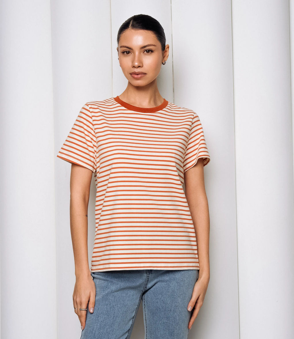Эта футболка прекрасный выбор для вашего магазина, предлагая стильный и универсальный дизайн, который станет отличным дополнением к гардеробу ваших клиентов. Эта модель представлена в классическом полосатом узоре, сочетая нейтральные и приглушенные тона, что делает её универсальной. Футболка с традиционным круглым вырезом и короткими рукавами, свободного кроя, что обеспечивает свободу движений и комфорт. Идеально подходит для сочетания с джинсами, шортами или брюками, а также может быть использована как базовый элемент для создания многослойных образов. Выполненная из ткани с 95% хлопка и 5% полиэстер, футболка обеспечивает отличное качество и приятные тактильные ощущения. Независимо от сезона, она станет любимым элементом в гардеробе ваших клиентов. На странице сайта доступна таблица размеров, что позволит вашим покупателям легко найти подходящий вариант. Установленная цена делает эту футболку доступной для широкой аудитории, что обеспечит вам высокий уровень продаж. Рост модели: 164, параметры: 83-61-89. -- Характеристики -- Цвет: терракотовый Пол: Женский Страна производитель: Китай Сезон: Всесезонный Материал: Хлопок, Полиэстер