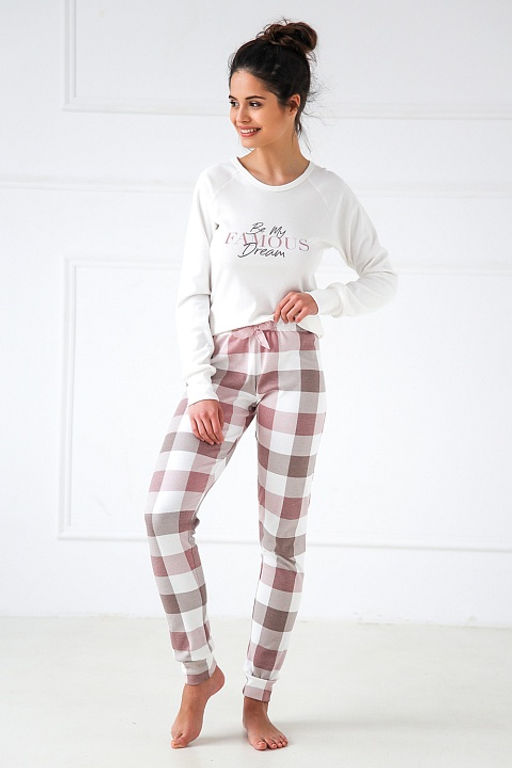 Хлопковая пижама Joselyn состоит из лонгслива с надписью и зауженных брюк. На рукавах манжеты. Отличный вариант для домашнего отдыха.­