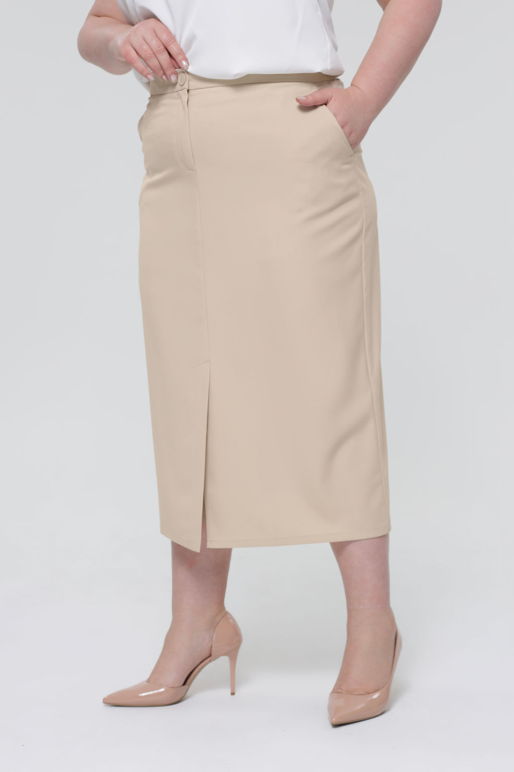 Элегантная юбка-карандаш из мягкой ткани с добавлением стрейча. Модель отлично сидит за счет притачного пояса. Боковые карманы с отрезным бочком добавляют юбке практичности и функциональности. Модель с комфортной посадкой не сковывает движений,  застегивается спереди на пуговицу и скрытую молнию. Центральный шов по переду переходит в  кокетливую шлицу. Всесезонная,  практичная, универсальная модель юбки отлично структурирует и собирает фигуру в проблемных местах за счет плотности ткани и конструктивных швов. Являясь базовой моделью, удачно сочетается с обувью и одеждой разных стилистических направлений, прекрасно вписываясь как в классический, так и альтернативный гардеробы, создавая актуальные вариативные образы на все случаи жизни.­