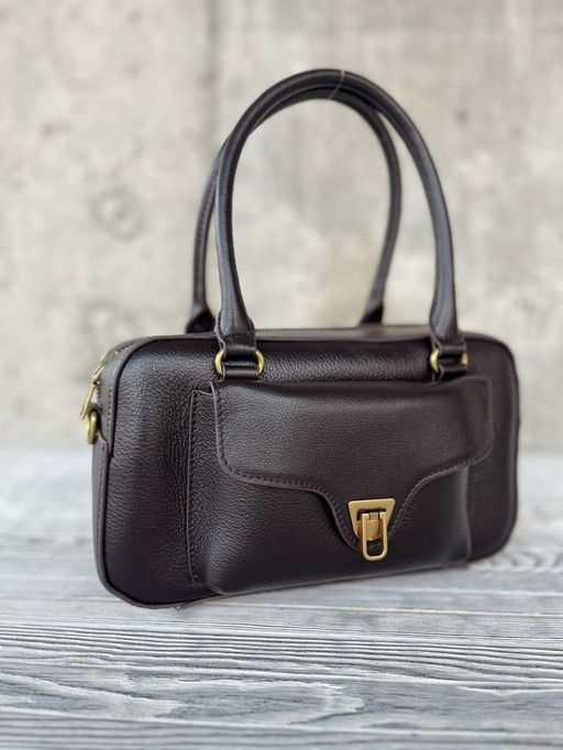 Женская сумка бочонок из натуральной мягкой кожи цвета кофе, с золотистой фурнитурой.