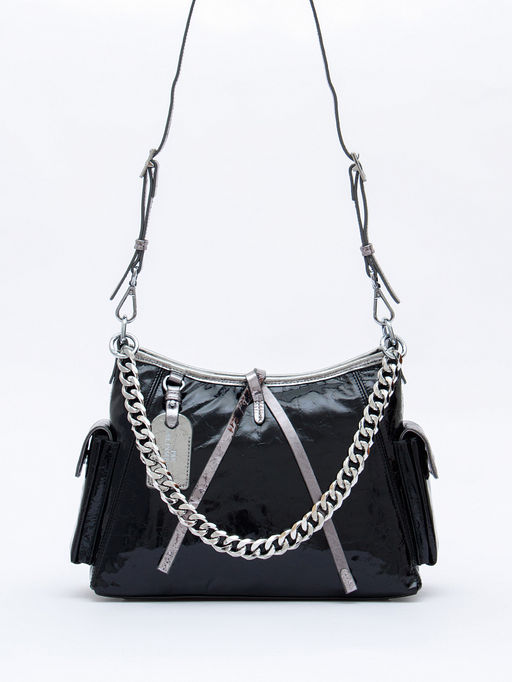 Акцентная модель, выполнена из натуральной кожи. Декорирована цепочкой на клапане. Дополнена серебристой фурнитурой. Данная модель закрывается на молнию, носится на плече, в комплекте имеется ремень с регулировкой длины. Каркас полужесткий.