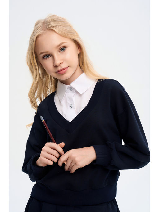 Джемпер-обманка для девочки из трикотажного полотна и текстиля, прямого силуэта, с длинными втачными рукавами с манжетами, на поясе. Горловина V-образная, воротник на стойке из текстиля, застежка на пуговицы. Состав:92% хлопок, 8% лайкра
