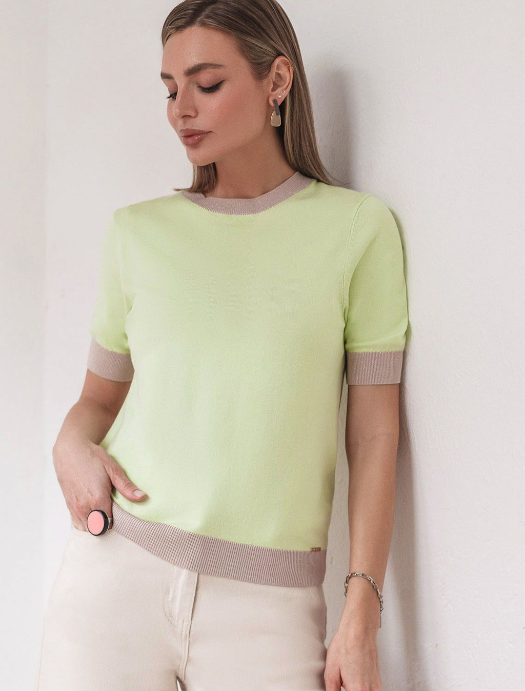 Легкий джемпер светло-зеленого цвета с круглым вырезом идеально подходит на весну и лето. Тонкая вязка из вискозы дарит приятный комфорт и ощущение свежести в теплую погоду. Полуприлегающий крой подчеркивает силуэт, а универсальная длина позволяет сочетать джемпер с разными элементами гардероба. Контрастная отделка с мягким люрексом добавляет стильный акцент, создавая выразительный образ. Деликатное мерцание придает праздничное настроение, но не выглядит слишком ярко или вызывающе. Такой элемент украшения позволяет носить нарядный джемпер и на особых мероприятиях. Джемпер отлично смотрится на больших размерах благодаря продуманному крою и полуприлегающему фасону. Этот джемпер с коротким рукавом станет незаменимой частью гардероба в сезоны, когда хочется легкости и элегантности одновременно. Лаконичный дизайн обеспечивает простоту комбинирования с другими вещами и будет универсальной базой для создания разнообразных комплектов от офисного до непринужденного городского стиля.­
