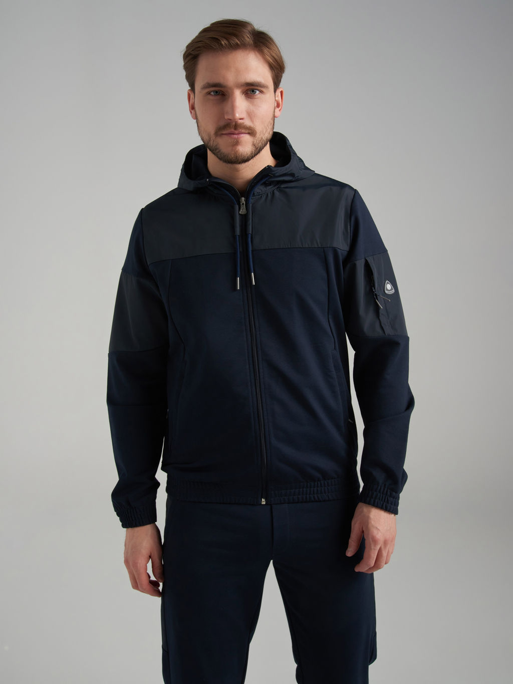 Тип материала: футер-диагональ ? Футер-диагональ с эластаном это высококачественное смесовое хлопчатобумажное трикотажное полотно. Такой состав и особая технология плетения позволяют достичь прочности и формоустойчивости полотна, при этом оно сохраняет легкость и воздухопроницаемость хлопка и хорошо растягивается в двух направлениях. Спортивные изделия из такого полотна очень функциональные, поддерживают широкую амплитуду движений, что очень важно для использования этой одежды для занятий фитнесом, пилатесом и йогой. Спортивный костюм из хлопкового трикотажного полотна .Куртка костюма на поясе, с воротником-стойкой, с капюшоном, застегивается на молнию. Рукава втачные. Несколько деталей костюма изготовлены из водонепроницаемой плащевой ткани в тон изделия - это капюшон,кокетка куртки, вставка левого рукава и боковые вставки брюк. Карманы куртки и брюк с молниями, распологаются в рельефах. На рукаве куртки слева предусмотрен дополнительный карман, он также с молнией. Капюшон ветрозащитный, с высокой цельнокроенной стойкой. Пояс и манжеты куртки собраны на эластичную резину. Брюки прямые, зауженные книзу. Пояс брюк по линии талии так же с эластичной резинкой, дополнительно регулируется шнуром. На левом рукаве и под левым карманом брюк нашиты шевроны с фирменным логотипом.