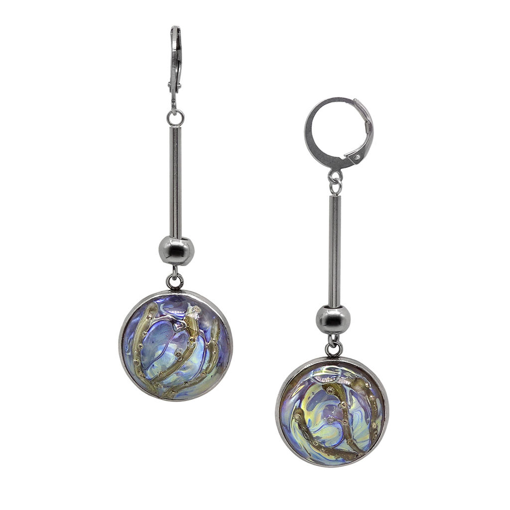 Серьги изготовлены из муранского стекла и гипоаллергенной ювелирной стали, что очень важно для людей с чувствительной кожей. Металл не темнеет и не подвергается воздействиям окружающей среды, надолго обеспечивая красивый внешний вид изделия. Длина серег - 6 см. Диаметр стеклянного элемента - 2 см.  Вес обеих серег - 11 гр.­