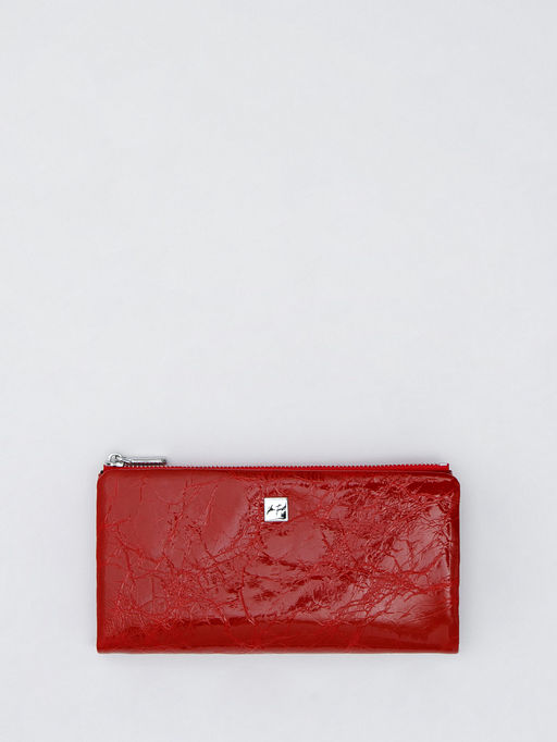Кошелек женский из натуральной лаковой кожи. Модель раскладывается пополам, внутри два открытых отдела под купюры, шестнадцать карманов для визиток и пластиковых карт. Снаружи карман на молнии, на задней стенке карман на молнии под мелочь. Фурнитура блестящее серебро­