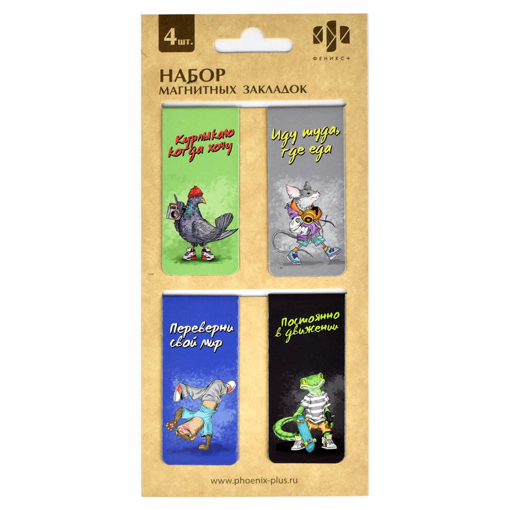 Набор закладок магнитных для книг арт. 61147 / 100 ЗВЕРИ НА СТИЛЕ ( 4 шт. в наборе, размер 25х58 мм, материал: мелованная бумага, магнитный винил 0.4 мм; цвет: полноцветный дизайн, особенности: глянцевая ламинация, индивидуальная упаковка: ПЭТ-пакет с европодвесом)