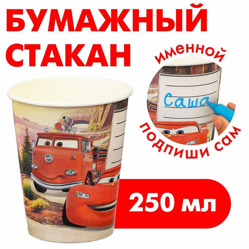 Цена за 10 шт. Стакан одноразовый бумажный "С Днем Рождения!", 250 мл, Тачки