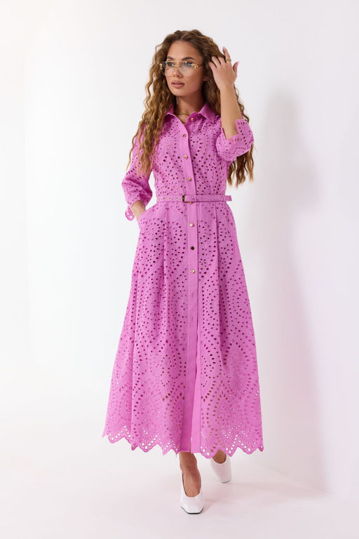 Платье из хлопковой ткани. Длина макси. Застежка на петли и пуговицы. Платье отрезное по талии. Воротник рубашечный.  Рукав прямой ?. По юбке платья складки. В боковых швах карманы. В комплекте съемный ремень с пряжкой. Юбка платья на хлопковой подкладке.