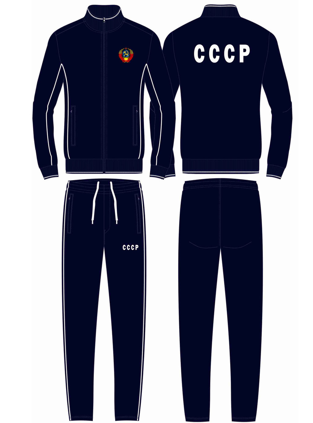 Спортивный костюм из хлопкового трикотажного полотна. Куртка костюма на поясе, с воротником-стойкой, застегивается на молнию. Рукава покроя реглан. По плечевому шву рукавов и боковым швам брюк проложен кант белого цвета. Стилистика костюма поддерживается белой вставкой по плечам. карманы куртки и брюк прорезные с планками, застегиваются на молнии. Пояс, воротник и манжеты куртки изготовлены из эластичного подвяза с узкой белой полосой . Брюки прямые, зауженные книзу. Пояс брюк по линии талии с эластичной резинкой так же дополнительно регулируется шнуром. Слева на груди и под левым карманом брюк нашиты шевроны с фирменным логотипом...