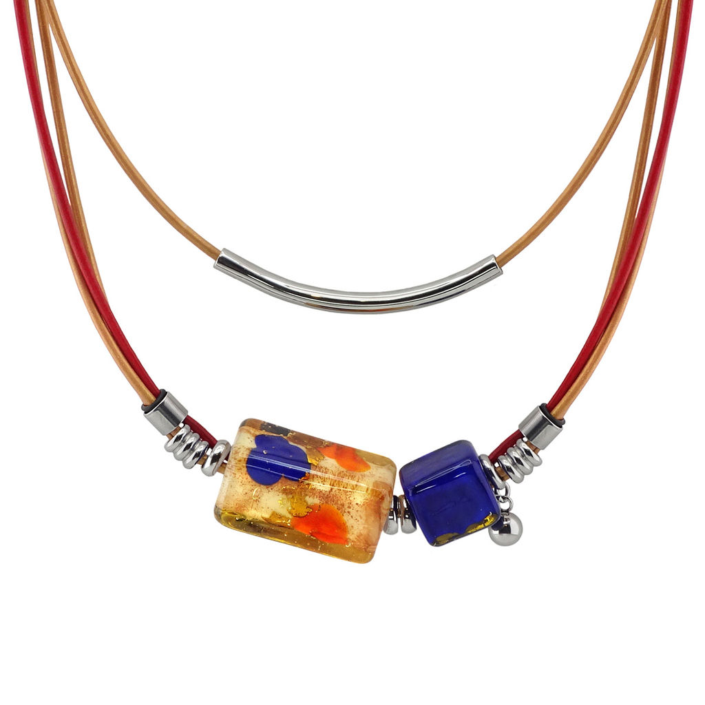 Колье изготовлено из натуральной кожи, муранского стекла и гипоаллергенной ювелирной стали, что очень важно для людей с чувствительной кожей. Металл не темнеет и не подвергается воздействиям окружающей среды, надолго обеспечивая красивый внешний вид изделия. Длина колье - 90 см + 5 см. удлиняющая цепочка. Размер регалиса - 2,7х1,5, размер куба - 1,4 см. Вес - 29 гр.