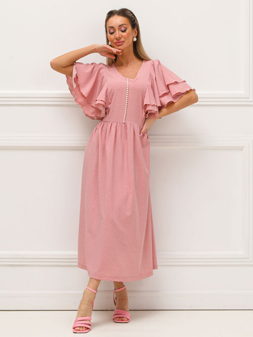 Восхитительное платье полуприлегающего силуэта из текстильной ткани розового цвета.. Фигурный вырез изделия обработан внутренней обтачкой. Верхняя часть переда дополнена декоративным элементом из бусинок. Втачные рукава выполнены в форме широких оборок. Линия талии завышена и эффектно подчеркнута сборкой. Пояс в комплект не входит. Длина изделия по спинке от плечевого шва до низа изделия - 123 см. Рост фотомодели - 170 см.­