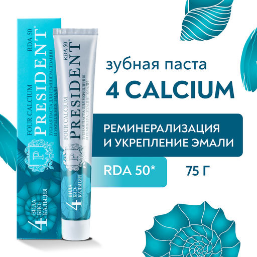 Зубная паста PRESIDENT Four Calcium RDA 50* способствует реминерализации и укреплению эмали. Уникальный комплекс из 4х видов биодоступного кальция реминерализует зубную эмаль, Папаин расщепляет белковый налет. Эффективность зубной пасты клинически доказана: Снижает чувствительность зубов до 76%; уменьшает количество налета на 47%; уменьшает воспаление десен на 57%.