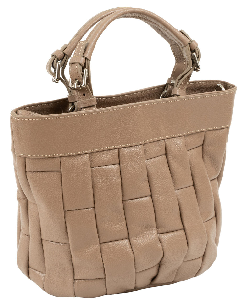 Страна: Италия Акции: Товары со скидкой Производитель: Pelletteria Luisa, Italy Размер: средняя Стиль ношения: короткие ручки в руках Форма: мягкая Выделка кожи: зернистая износостойкая Цвет кожи: Бежевый Оттенок: темно-бежевый Упаковка: Пакет тканевый L, 40x40 см Размеры: длина: 22 см \tвысота: 22 см \tширина: 14 см \tвысота ручек: 11 см Описание: Компактная изящная женская сумка из натуральной кожи. Италия. Сумочка имеет мягкую форму, выполнена из матовой телячьей кожи, сшита в геометрической узор, зернистой износостойкой выделки. Будет органично смотреться как повседневная модель, идеально дополнит деловой или классический образ, также вы сможете поэкспериментировать с этой моделью в винтажном стиле. Закрывается на молнию, внутри 1 большое отделение, 1 карман на молнии и 2 накладных тканевых кармашка для мелочей на боковых стенках. Используется фурнитура итальянского качества в серебряном цвете. Внутренняя отделка - качественная, водоотталкивающая, приятная на ощупь и долговечная в использовании, ткань. В комплекте идет плечевой кожаный ремешок, который регулируется по длине. Основные ручки также регулируются по высоте. Модель можно носить в руке, на запястье, на плече или через плечо удобно и практично!