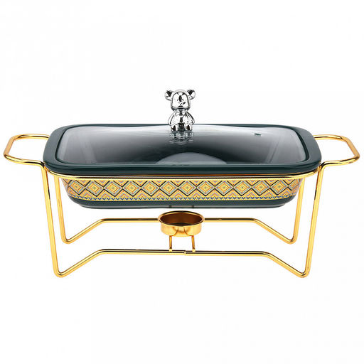 "Мармит Изумруд" Форма для запекания 750мл, прямоугольная, 25,5х15,5см h4,8см, керамика с деколью, цвет - изумрудный, стеклянная крышка с пароотводом, пластмассовая ручка-кнопка "мишка", металическая подставка с ручками, с подогревом на 1 свечу 32,8х