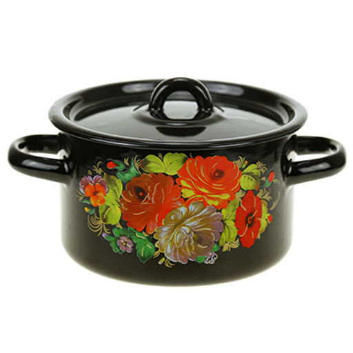 • "Жостово" Кастрюля эмалированная 1,5л, д15см, h9см, цилиндрическая форма, металлическая крышка, черный (Россия)