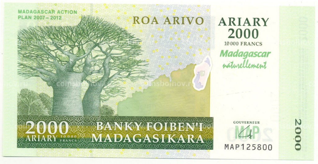• Банкнота 2000 ариари 2007 года Мадагскар  План развития 2007-2012