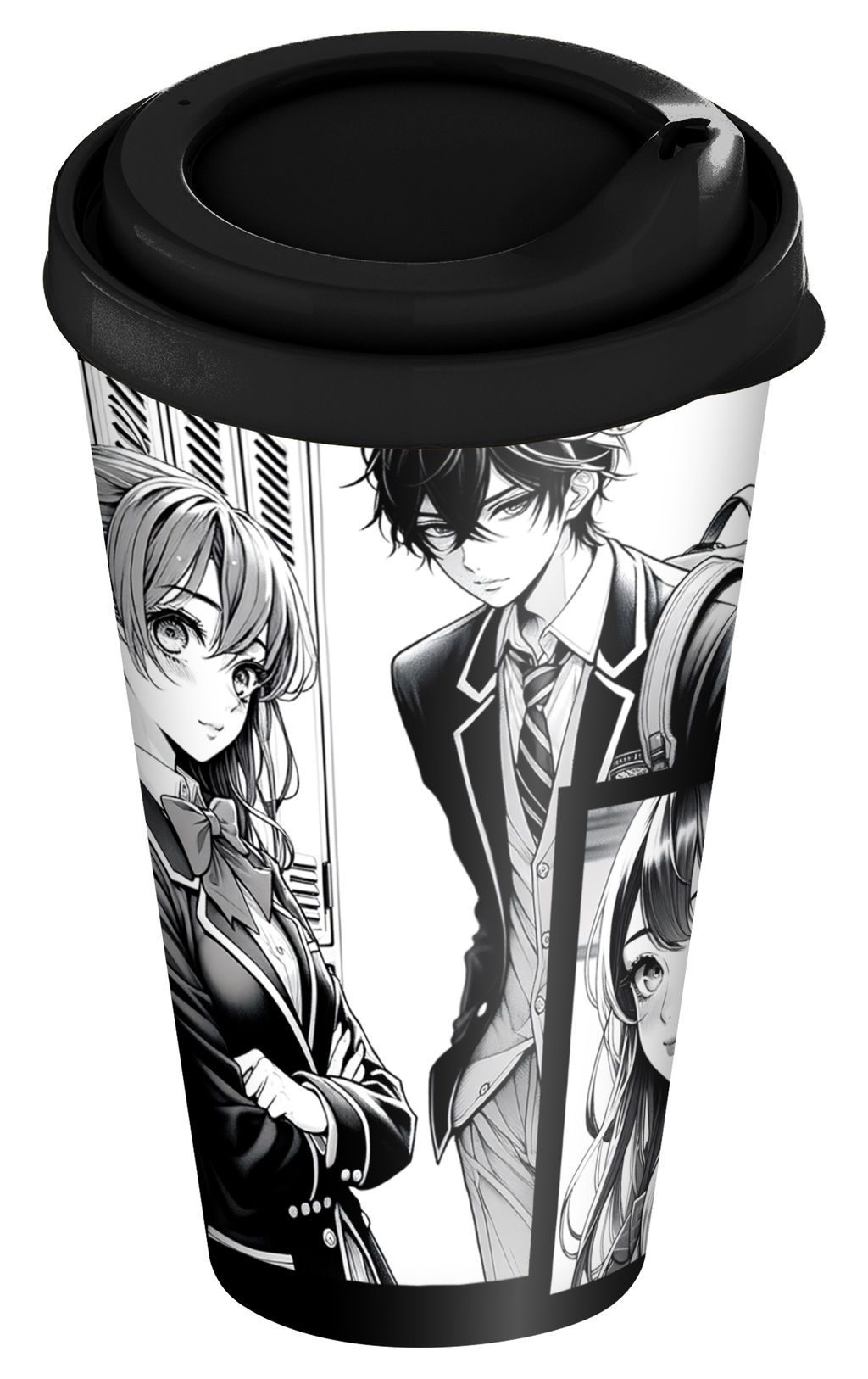 Стакан с крышкой 550мл с декором "Аниме" (черный) 223134830/01 с крышкой имеют комфортный диаметр корпуса, удобно ложатся в руку и подходят к подстаканникам в машине.­