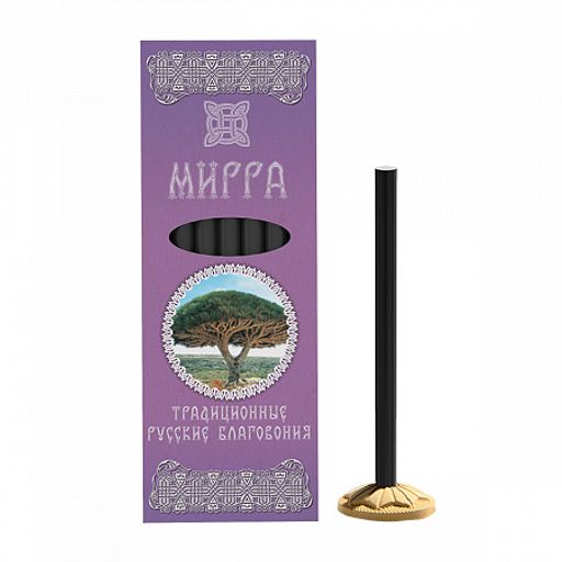 Русские благовония с подставкой. У благовония мирра совершенно неповторимый запах - горьковатый, слегка напоминающий эвкалипт или кипарис с постепенным проявлением свежего приятного и сложного аромата, сочетающего камфарные и травянистые оттенки. Эмоционально аромат мирры несет умиротворение и успокоение, он способствует снятию усталости, нагрузок, стрессов, эффективен при депрессии и бессоннице. Мирра создает ощущение покоя, защищенности, надежности, является духовно исцеляющим запахом, прекрасно подходящим для медитаций.