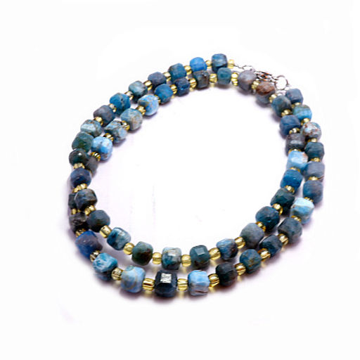 Описание товара Бусы из амазонита Гармония Амазонки. Изящное колье длиной 45 см, где огранённые кубики амазонита диаметром 4 мм чередуются с золотистыми бисеринами миниатюрная мозаика нежно-бирюзовой глубины и солнечного тепла. Каждый кубик амазонита, с чёткими гранями и полированной поверхностью, переливается оттенками от мятно-голубого до сочного бирюзово-зелёного с характерными белыми мраморными прожилками природным узором, возникающим из-за включений других минералов и подтверждающим подлинность камня. Золотистый бисер из стекла мягко разделяет камни, создавая ритмичную игру цвета и добавляя украшению изысканного сияния. Надёжный замок карабин из ювелирного сплава обеспечивает комфортное ношение, а длина 45 см идеально ложится на ключицы, подчёркивая спокойную элегантность.