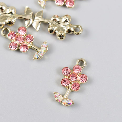 Цена за 5 шт. Декор для творчества металл, стразы Цветочек розовый с листиками, золото 1.1?2 см
