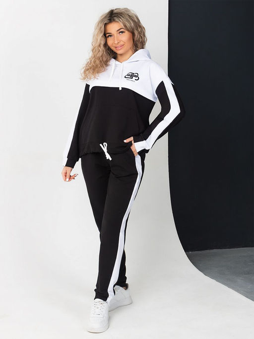 Костюм женский спортивный состоит из толстовки худи и брюк. Толстовка свободного кроя  с кокетками спереди и на спинке. На толстовке карман-кенгуру, плечо спущенное, рукава длинные, на рукавах лампасы. Низ рукава с манжетами. Низ толстовки с кулисой и шнурком. Капюшон двойной с кулисой и шнурком. Внешний капюшон, кокетки и лампасы выполнены в контрастном цвете. На кокетке толстовки нанесен оригинальный принт-логотип. Брюки джоггеры свободной формы. Пояс на резинке с декоративными строчками. Боковые внутренние карманы. Боковые лампасы брюк в контрастном цвете. Низ брюк с манжетами.