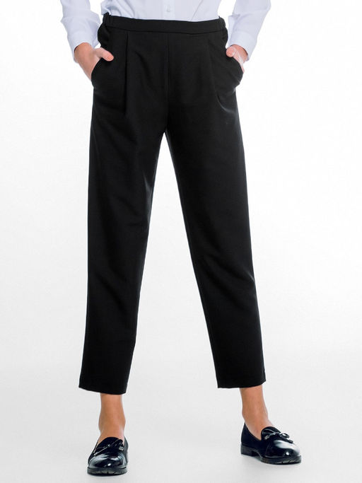 Брюки для девочек среднего и старшего школьного возраста. Брюки бананы умеренного объёма со складками у пояса, направленными к боковым швам, карманами и притачным поясом. Боковые карманы наклонные с отрезными бочками. Задние половинки брюк с талиевыми вытачками. Пояс притачной с перфорированной резиной (для возможности регулировки объёма по талии).
