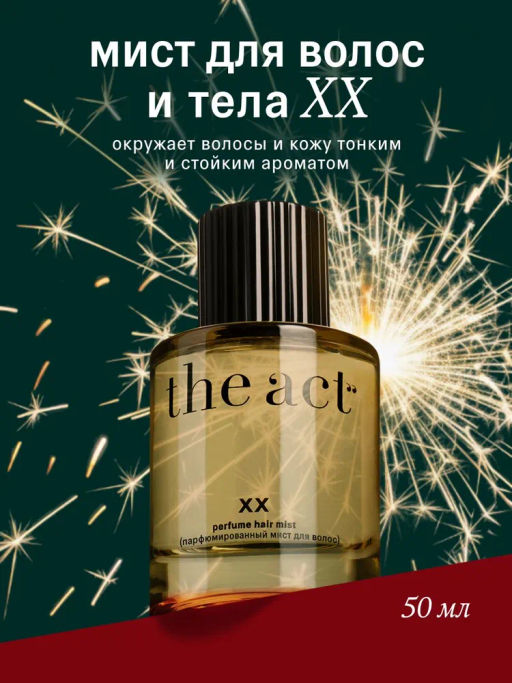 Описание товара Нет огня без дымки, — подумали мы и решили зажечь огонёк в твоих глазах. Дымка для волос ХХ от The Act окутывает волосы ароматной вуалью, обладает антистатическим эффектом и защищает от повреждений. Ощути «Эффект XX» на твоей коже и волосах.