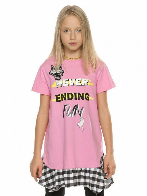 Комплект для девочек туника и велосипедки. Новинка. Туника с круглым вырезом горловины, коротким втачным рукавом и фигурным клетчатым воланом по низу. Шрифтовая неоновая композиция с серебряным металликом и глиттером. Перевод Никогда не заканчивающееся веселье. Аппликация в виде котика из разноцветных страз. Велосипедки черного цвета длиной до колена.