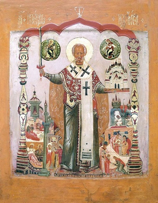 Происхождение XVII век. Хранится в Череповецком музейном объединении. Описание Образ Николы Можайского, является вариантом иконографического типа святого Николая Зарайского. В иконах этого типа святой представлен не с книгой и платом, а с мечом и храмом в разведенных руках. Вверху по сторонам от его фигуры изображены Богоматерь и Иисус Христос с Евангелием и омофором. Прототипом этого образа считается статуя святого Николая, установленная на городских воротах или в городском соборе Можайска. Еще одной особенностью икон данной иконографии является помещение арки, часто килевидной формы, над фигурой святителя. Чудо, явленное святым Николаем и послужившее спасению города от вражеской рати, положило начало прославлению и распространению этого образа. Сохранилось предание о помощи святого Чудотворца жителям города Можайска, осажденного в XIV веке монголо-татарами. В ответ на молитвенное к нему обращение в одной из церквей города последовало чудесное видение: Святой Николай возник на небе, в грозном виде стоящим над собором. Одной рукой он поднял сверкавший меч, готовый опуститься на головы врагов, в другой держал как бы град Можайск в знак охранения его. Меч и храм, как символы военного одоления и помощи в ратных делах, одновременно напоминали о горячей защите православной веры и учения Христа. Устрашенные грозным знамением, враги в ужасе бежали от стен Можайска, а жители в благодарное воспоминание могущественного заступничества вскоре вырезали из дерева изображение своего святого покровителя в том образе, который увидели на небе. Известный под именем Николы Можайского этот образ стал одним из самых распространенных и любимых на Руси. Артикул: 00421 Высота: 210 мм. Ширина: 165 мм. Глубина: 20 мм. Материалы: Дерево, пигментные краски, матовый лак Примечания: Икона соответствует православным канонам и освящена Упаковка: Все иконы поставляются в подарочной упаковке и с подробным описанием.