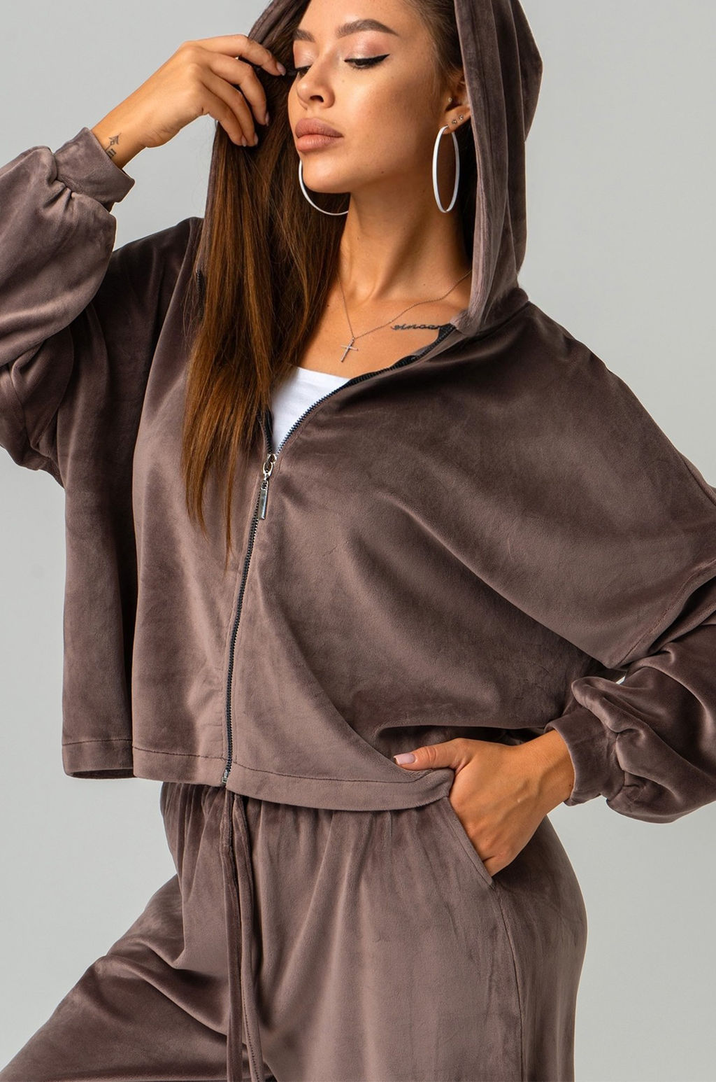 Бренд: Happyfox Серия: Happyfox- Велюровые костюмы Страна: Киргизия Состав: 96% полиэстер, 4% спандекс Материал: Велюр Цвет: капучино Осенние дни станут еще уютнее! Женский бархатный спортивный костюм с брюками представлен в оттенке капучино. Нежный велюр дарит ощущение мягкости и легкости. Велюровая ткань не только привлекает внимание своей роскошной текстурой, но и сохраняет форму, обеспечивая комфорт на протяжении дня. Толстовка с капюшоном и застежкой на молнии дарит защиту от прохлады, а широкие штаны с высокой посадкой создают расслабленный силуэт. Заниженная линия плеч добавляет легкую небрежность в образ, а крой оверсайз (oversize) позволяет чувствовать свободу движений. Манжеты на длинных рукавах обеспечивают идеальную посадку и сохраняют тепло. Эластичный пояс на резинке регулируется при помощи шнурка, а практичные карманы на штанах делают велюровый костюм идеальным для активных дней или уютного отдыха. Однотонный коричневый костюм двойка для женщин станет отличным выбором для прогулок осенью, занятий спортом или отдыха. Модель Анфиса, ее рост 170, параметры: 88-67-97. На ней размер 44. Размер 44: джемпер: длина:52 см; ширина:62 см; длина рукава внешняя:66 см; длина рукава внутренняя:33 см. брюки: длина внеш.шва:105 см; длина внутр.шва:72 см; ширина по бедрам:55 см. Размер 46: джемпер: длина:54 см; ширина:64 см; длина рукава внешняя:68 см; длина рукава внутренняя:34 см. брюки: длина внеш.шва:106 см; длина внутр.шва:74см; ширина по бедрам:56 см. Размер 48: джемпер: длина:56 см; ширина:66 см; длина рукава внешняя:70 см; длина рукава внутренняя:35 см. брюки: длина внеш.шва:107 см; длина внутр.шва:76 см; ширина по бедрам:58 см. Размер 50: джемпер: длина:58 см; ширина:69 см; длина рукава внешняя:71 см; длина рукава внутренняя:36 см. брюки: длина внеш.шва:108 см; длина внутр.шва:78 см; ширина по бедрам:63см; Размер 52: джемпер: длина:60 см; ширина:72 см; длина рукава внешняя:73 см; длина рукава внутренняя:37 см. брюки: длина внеш.шва:109 см; длина внутр.шва:80 см; ширина по бедрам:68 см. *замеры выборочные, могут незначительно отличаться.