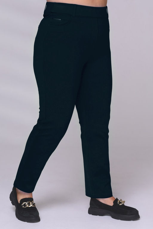 Однотонные брюки-стрейч выполнены из плотной мягкой ткани  с начесом. Модель отлично сидит за счет комфортной резинки на поясе. Имеет накладные карманы сзади и декоративные карманы спереди, один из которых украшен металлической молнией. Зауженные к низу брючины визуально стройнят и зрительно вытягивают силуэт. Эти универсальные брюки легко впишутся в любой гардероб благодаря лаконичному дизайну и классическому крою. Отлично сочетаются с рубашками, свитерами или блузами. Брюки подойдут как для повседневных образов, так и станут отличным выбором для работы или деловой встречи.­