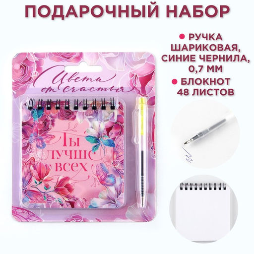 Подарочный набор станет прекрасным подарком на праздник.Набор содержит 2 предмета :• Мини-ручка 1 шт. ;• Блокнот 1 шт.Состав: Бумага, картон, пластик, чернила;Размер: 13,5 см х 15 см;Линовка блока: без линовки;Тип скрепления: на гребне/спирали;Количество листов: 48. Для кого: Для женщины. Формат: Квадрат. Линовка блока: Без линовки. Тип скрепления: На гребне/спирали. В наборе, шт.: 2. Количество листов: 48. Отделка: Без отделки. Вид упаковки: Пакет. Тематика праздника: 8 Марта. Адресат: Без адресата. Составляющие набора: Блокнот. Составляющие набора: Ручка. Возраст: Для взрослых. Вид обложки: Мягкая. Дизайн обложки: С рисунком. Бесплатная доставка: Да. Размеры товара: 15/1/13.5.