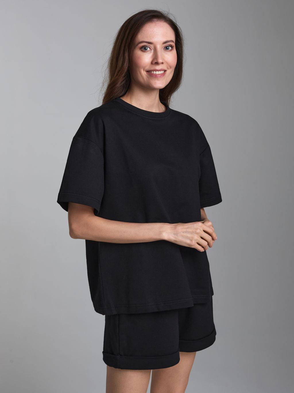 Женский спортивный костюм летний из хлопкового трикотажного полотна. Верх костюма - футболка свободного силуэта оверсайз с заниженой линией плеча, с коротким рукавом. Нижняя часть комплекта - шорты средней длины, с карманами в боковых подрезах, низ шорт - с отворотами. Пояс шорт на эластичной резинке.