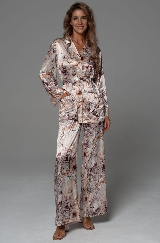 Комплект Mia-Amore состоит из рубашки с рукавами длиной 7/8, с центральной застежкой на пуговицы и брюк, выполнен из принтованного смесового шелка. Борт и воротник жакета декорированы контрастным кантом. Изделие комплектуется поясом. Состав:70% натуральный шелк, 25% полиэстер, 5% эластан