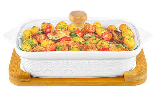 • Блюдо д/запекания и сервировки 1,1 л 30*18*13 см "Белый узор" с стекл крышкой на дер подст.