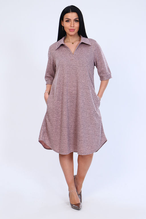 Платье расклешенное ,свободного кроя,рукав 3/4,в боковых швах имеются карманы,воротник рубашечного типа.Практично и удобно.