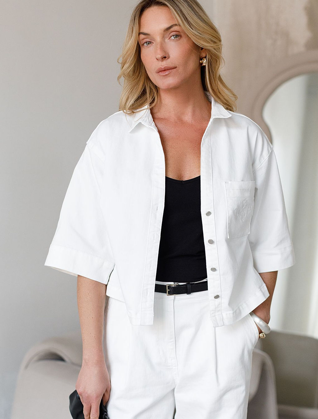 Укороченная рубашка белого цвета выполнена из облегченного денима плотностью 8 OZ. Джинсовая легкая рубашка идеально подходит для весны и лета. На кармане выполнена вышивка по авторскому эскизу дизайнера буквы V L T, оформленные вензельным шрифтом. Сама вышивка выполнена техникой застил машинным способом. Свободная рубашка отлично подходит для создания летних образов или стильных ансамблей на каждый день засчет своей универсальности. Отложной воротник создает аккуратный внешний образ. Широкий рукав средней длины гарантирует свободу движений и удобство на весь день. Джинсовую блузку можно сочетать в стиле кэжуал, а также создавать монохромные образы или добавлять яркие акценты с помощью аксессуаров. Эта укороченная блузка на пуговицах станет базовым элементом гардероба для тех, кто ценит сочетание классики, моды и удобства.