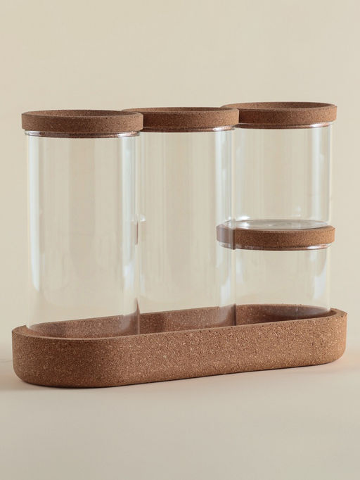 • Банки для сыпучих SL Home «Алькорноке», 2 банки 280 ми, 2 банки 650 мл, с пробковой крышкой, на подставке, стекло, прозрачные