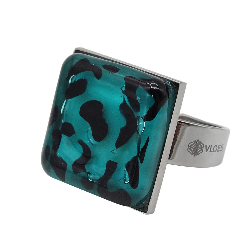 Кольцо изготовлено из муранского стекла и гипоаллергенной ювелирной стали, что очень важно для людей с чувствительной кожей. Металл не темнеет и не подвергается воздействиям окружающей среды, надолго обеспечивая красивый внешний вид изделия. Размер стеклянного элемента - 1,6*1,6 см. Кольцо безразмерное, регулируется с 16 до 19 размера. Вес - 5 гр.