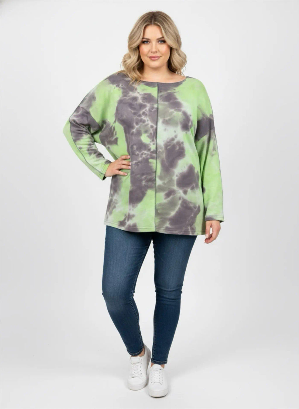 Модный лонгслив из футера с принтом тай?дай в серо?зелёной гамме идеальное решение для создания повседневных и спортивных образов. Модель разработана специально для женщин с пышными формами: продуманный крой и качественные материалы подчёркивают достоинства фигуры и скрывают несовершенства.