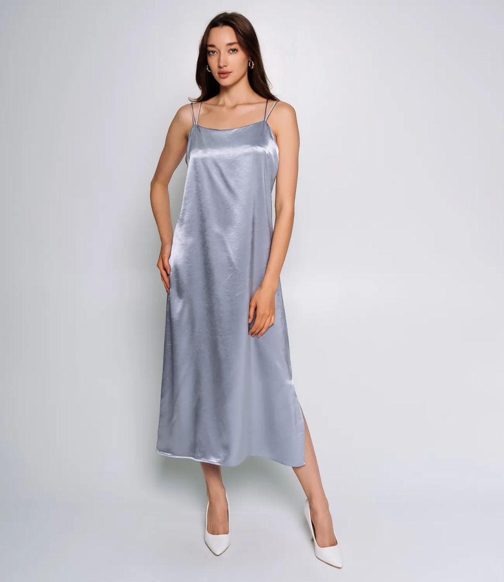 Элегантное платье, выполненное из 100% полиэстера с атласным эффектом, что придаёт изделию гладкую, блестящую поверхность и лёгкий перелив ткани при движении. Платье имеет прямой силуэт, который свободно ниспадает по фигуре, подчеркивая утонченность и элегантность образа. Длина платья достигает примерно середины икр, что создаёт баланс между изяществом и практичностью. Особенностью модели являются тонкие двойные бретели, которые аккуратно располагаются на плечах, придавая лёгкость и воздушность образу. Линия выреза прямоугольная по переду, без дополнительных украшений или драпировок, что усиливает минималистичный и современный стиль. Платье не имеет застёжек, карманов или других декоративных элементов, вся его привлекательность сосредоточена в простом, классическом крое и блеске ткани. Такое платье идеально подойдёт для вечерних мероприятий, торжеств или других случаев, когда требуется изысканный и стильный наряд. Рост 168, 85-63-92.­