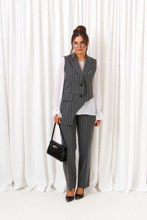 Жилет и брюки выполнены из элегантной и утонченной костюмной ткани стильного дизайна в полоску, отличающейся дорогим и роскошным внешним видом.