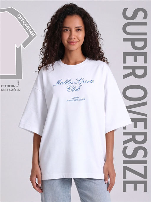 футболка,хлопок 92% + лайкра 8%,кулир с лайкрой / хлопок 92% + лайкра 8%,белый / - / Малибу / - / - / -,Оверсайз футболка для женщин выполнена из кулира - легкого хлопкового полотна с лайкрой. Изделие свободного покроя со спущенным плечом, рукавами длиной 2/3 и круглым вырезом горловины. Уход: только машинная стирка (руками не стирать!) при температуре 40 градусов, без предварительного замачивания.